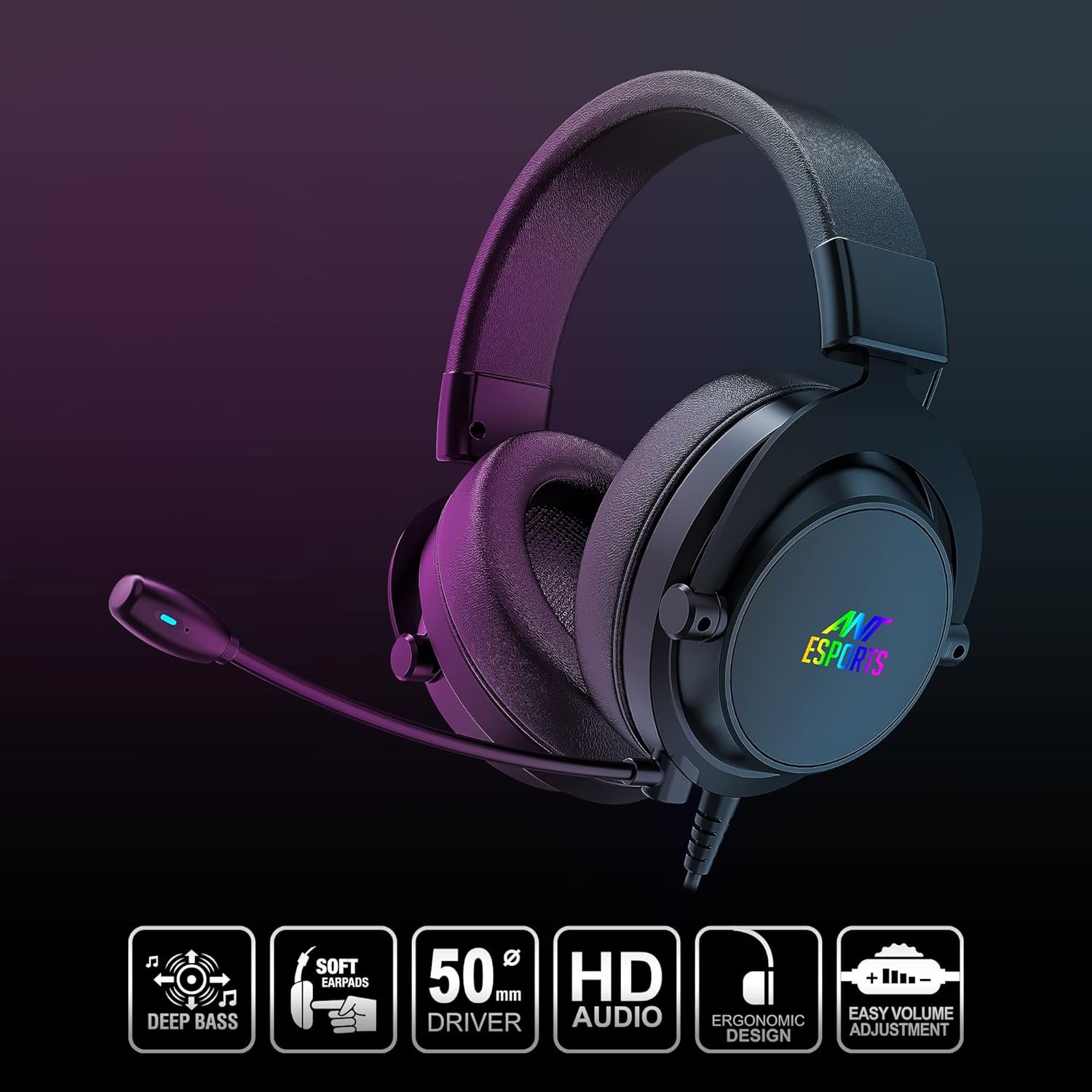 The Ant Esports Black H800 RGB Gaming Headset is crafted for gamers who want immersive audio, lasting comfort, and eye-catching style. It features large 50mm drivers that produce clear, detailed sound with deep bass and crisp highs, making every in-game effect and music track stand out. Soft memory foam ear cushions and an adjustable headband provide comfortable support for long gaming sessions, while the sleek black finish and RGB lighting give the headset a modern, stylish look.