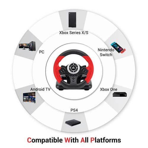 The set includes ergonomically designed pedals and a wheel with multiple function buttons, allowing comfortable and intuitive control. It is compatible with a wide range of platforms, offering flexibility in setup. Adjustable sensitivity and controls ensure a personalized gaming experience, making it suitable for both casual and serious gamers.