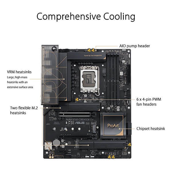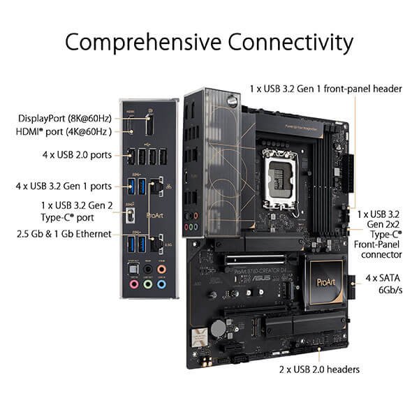 The ProArt B760-Creator D4 sets the standard for efficiency and excellence in modern computing. Whether you're building a high-performance workstation for content creation, multimedia production, or immersive gaming, this motherboard integrates innovative features with reliable performance to meet the demanding needs of creative professionals.