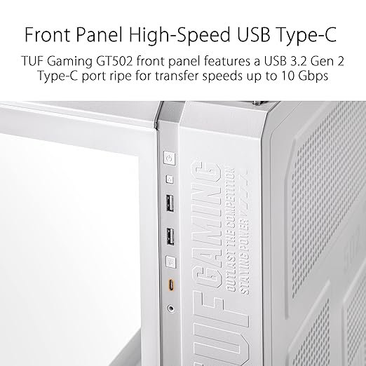 Tempered glass panels on the front and side of the case offer a clear view of the internal components, allowing users to showcase their build with a sleek and modern aesthetic. Front Panel High-Speed USB Type-C: