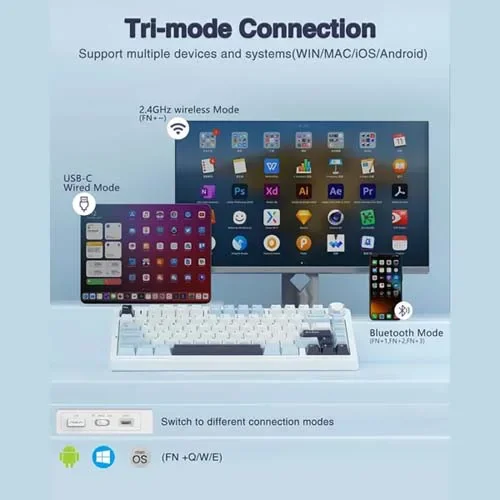 The Aula F75 offers three connection options—wired USB, Bluetooth, and 2.4GHz wireless. This flexibility allows users to connect multiple devices and switch between them effortlessly, making it suitable for both professional and gaming environments.