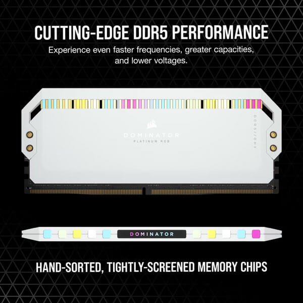 The Corsair Dominator Platinum RGB White RAM is a high-performance memory kit designed for enthusiasts, gamers, and content creators who demand speed, reliability, and aesthetics. This kit features two 16GB DDR5 modules, giving a total of 32GB of memory. With its highest frequency of 6200MHz, it provides extremely fast data transfer rates, making it ideal for heavy multitasking, 3D rendering, video editing, and high-end gaming. CL36 latency indicates how quickly the RAM can respond to a request. A lower number is faster, so CL36 is a good balance between speed and efficiency. DDR5 technology offers significant advancements compared to DDR4, delivering increased bandwidth, improved energy efficiency, and enhanced error-correction features.