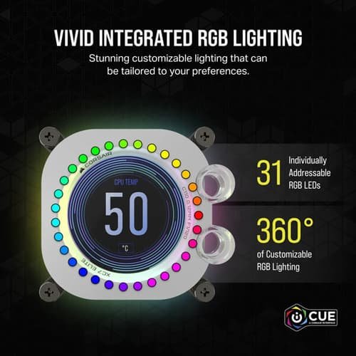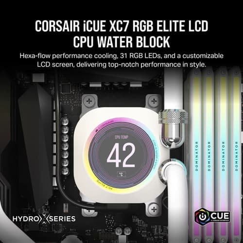 The CORSAIR iCUE XC7 RGB ELITE LCD CPU Water Block – White is a premium cooling solution designed for modern processors, compatible with Intel 1700 and AMD AM5 sockets. It combines high-efficiency thermal management with a fully customizable LCD display and iCUE-controlled RGB lighting, keeping your CPU cool while adding a dynamic visual element to your build.