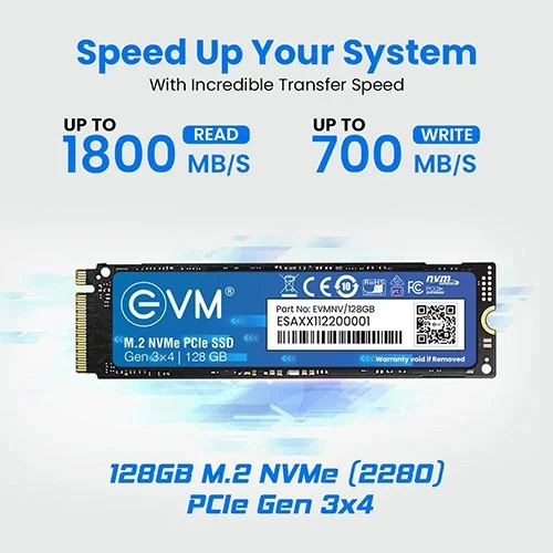 The EVM 128GB NVMe Gen3 SSD is a small but very fast storage drive that helps our computer runs more quickly and smoothly. Unlike older hard drives, which have spinning disks inside, this SSD uses solid memory chips to store data. This means it can read and write information much faster, so your computer starts up quickly, programs open almost instantly, and moving files around is much smoother. As it has no moving parts, it is also more durable and less likely to get damaged if the laptop or computer is hit accidentally.” The drive uses a modern connection called NVMe over PCIe Gen3, which is much faster than the older SATA connection used in many standard SSDs and hard drives. This technology allows it to handle large amounts of data quickly, making it ideal for daily computing tasks like opening apps, browsing the web, or even light video editing. It also consumes less power and works quietly, which is perfect for laptops and small computers where efficiency and silence are important. In short, it makes our computer feel much more responsive and reliable.