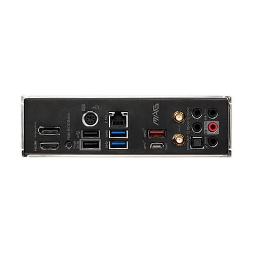 | Back panel ports | DisplayPort 1.4 PS/2 Combo Port 2.5G LAN Port USB 3.2 Gen 2 10Gbps Type-A Wi-Fi / Bluetooth Antenna HD Audio Connectors HDMI 2.1 Port Flash BIOS Button USB 2.0 Port USB 3.2 Gen 1 5Gbps Type-A USB 3.2 Gen 2 10Gbps Type-C Optical S/PDIF OUT |
