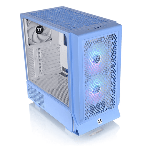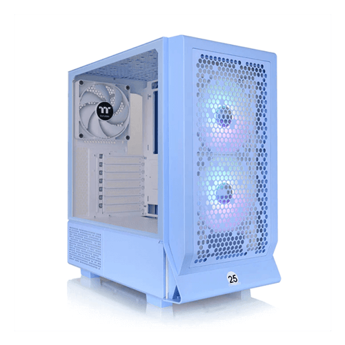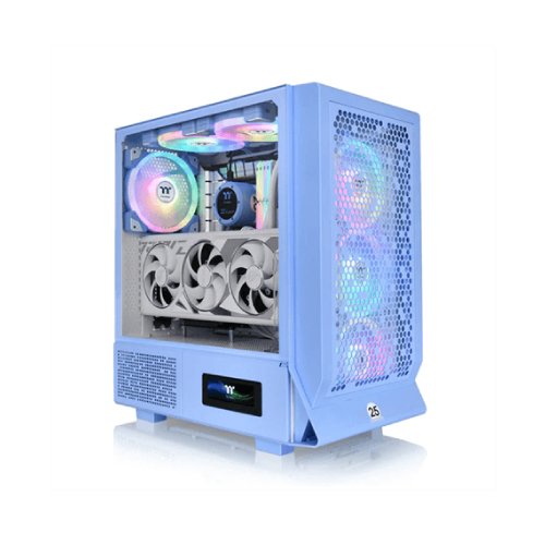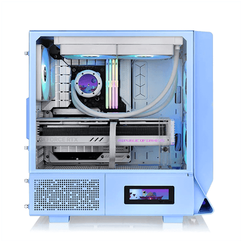 Visually Pleasing: The case boasts a visually pleasing aesthetic with its Hydrangea Blue color scheme. Additionally, users can enhance its visual effects by upgrading it with optional LCD Panel Kits or 3.9'' LCD Screen Kits. These kits allow users to monitor real-time information, upload images or GIFs, and interact with cooling components using the TT RGB Plus 2.0 software.