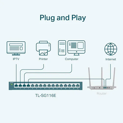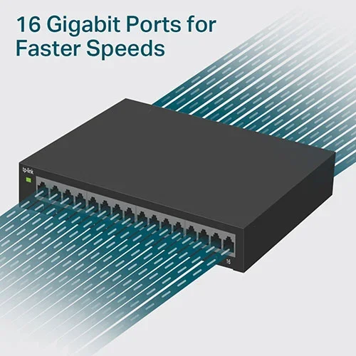 This switch provides sixteen 10/100/1000 Mbps ports, delivering high-speed wired connections for computers, servers, access points, smart TVs, and IP cameras. Gigabit speeds ensure faster data transfer, smoother file sharing, and reliable performance for bandwidth-intensive tasks such as HD streaming and large data backups.