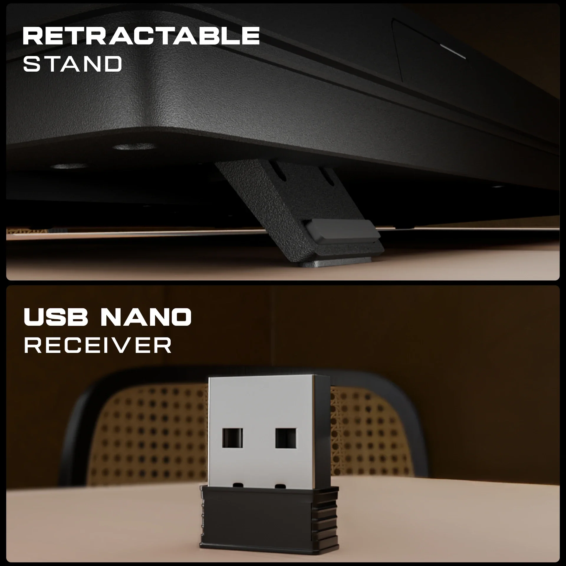 The built-in retractable stand allows users to tilt the keyboard to a preferred angle. This adjustment helps improve wrist posture and reduces strain during long typing sessions, contributing to a more ergonomic and comfortable experience.